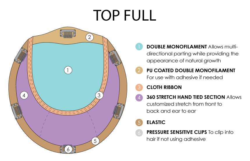 Designed for the advanced stage of hair loss, this one-piece hair topper features an 11.5" x 11"-base that adds volume over the entire crown. Top Full is available in 12" and 18" hair lengths, as well as synthetic and Remy human hair.