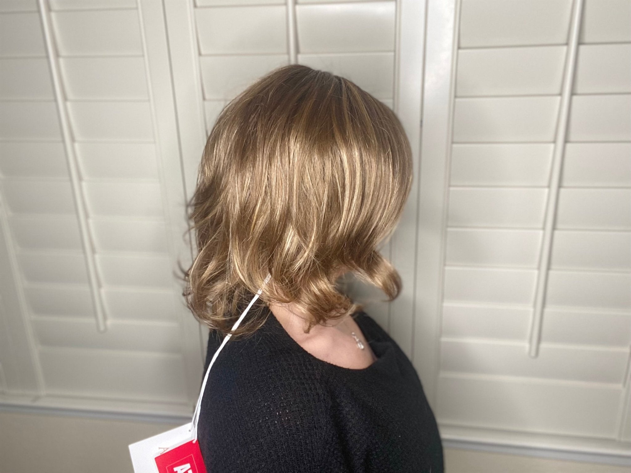 - Almond Rocka-R - Dark Root, Med Brn base with 50/50 of Med Copper Blond + Light Golden Blond Highlights