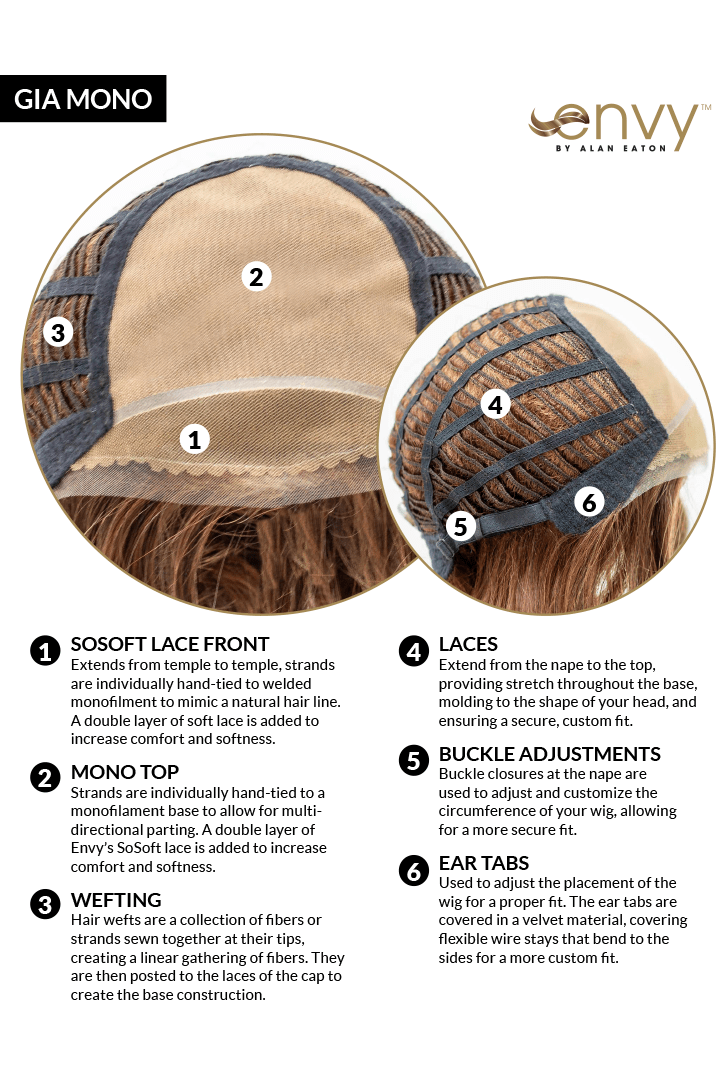 Gia Mono is a sophisticated creation inspired by Envy's best-selling bob style, Gia. Boasting Envy's new SoSoft cap design with and offering varying light-medium density, this medium style exudes effortless elegance with loose, carefree waves. The meticulously crafted lace front and monofilament construction allow the hair to be effortlessly parted in any direction, creating a remarkably natural look.