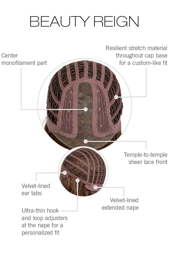 Designed for both style and comfort, this wig features a center monofilament part for natural-looking scalp detail, a temple-to-temple lace front for a seamless hairline, and a lightweight wefted cap in average size for breathable wear. Sophisticated yet easy to style, Beauty Reign is your go-to for elegance, versatility, and everyday royalty.