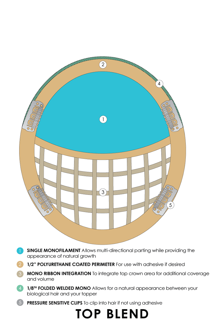 Top Blend was constructed to enhance coverage and volume in the crown by integrating your own hair for a supremely natural look. She features premium Remy Chinese human hair, ideal for those experiencing beginning to mid/progressive hair loss. This topper features a single monofilament base, durable mono ribbon integration at the back, and an all-around polyurethane-coated perimeter with four strategically placed pressure-sensitive clips.