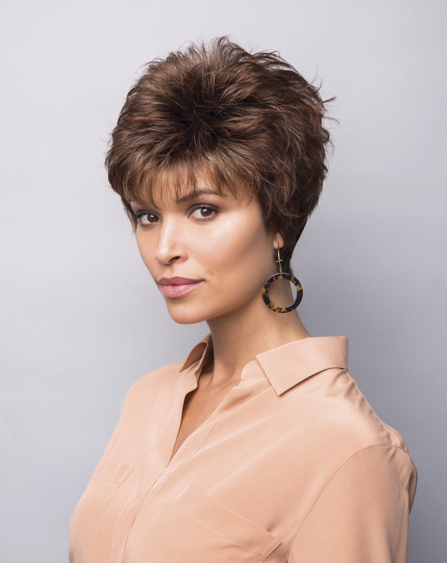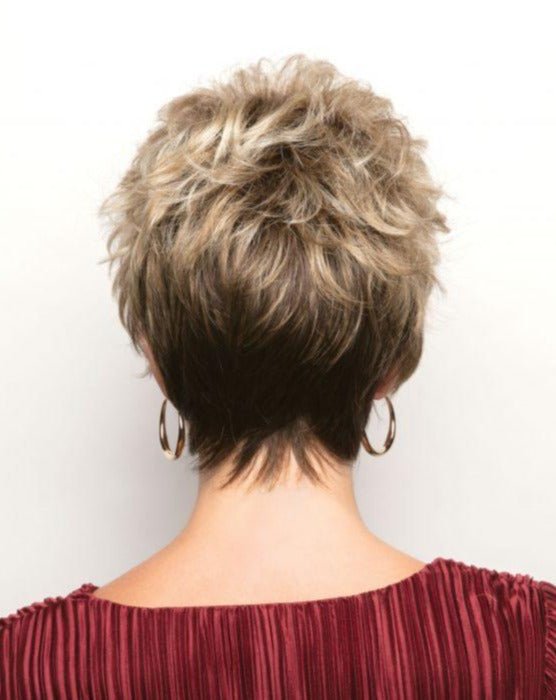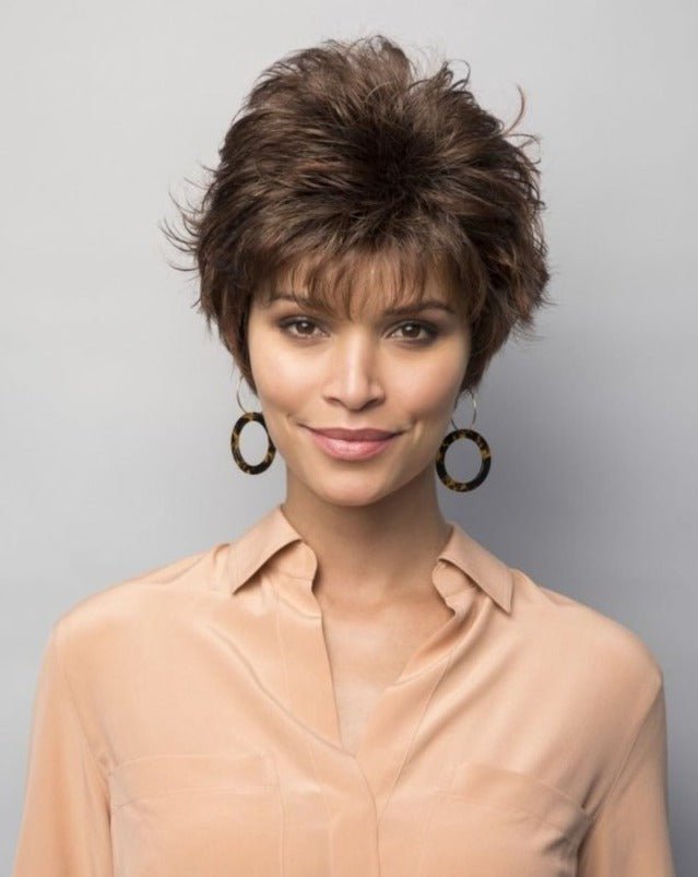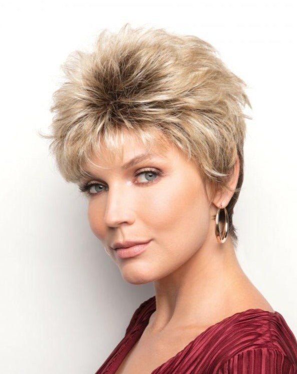 Drew from the Noriko Collection is an overall spiky layered wig and is designed with a chic cropped nape and perfect volume at the crown. Make a bold statement in this short, "edgy" pixie cut wig.