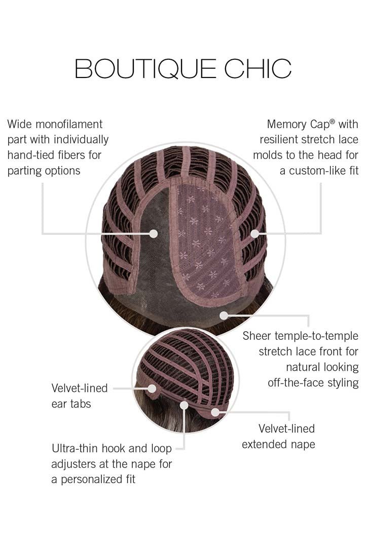 Crafted with Tru2Life® heat-friendly synthetic fibers, Boutique Chic can be heat-styled to suit your mood — smooth and polished or textured and piecey. The Memory Cap® construction conforms to your head shape for a secure, custom fit, while velvet-lined ear tabs and extended nape provide soft, all-day comfort. Effortless, modern, and unapologetically stylish — Boutique Chic is tailored to stand out.