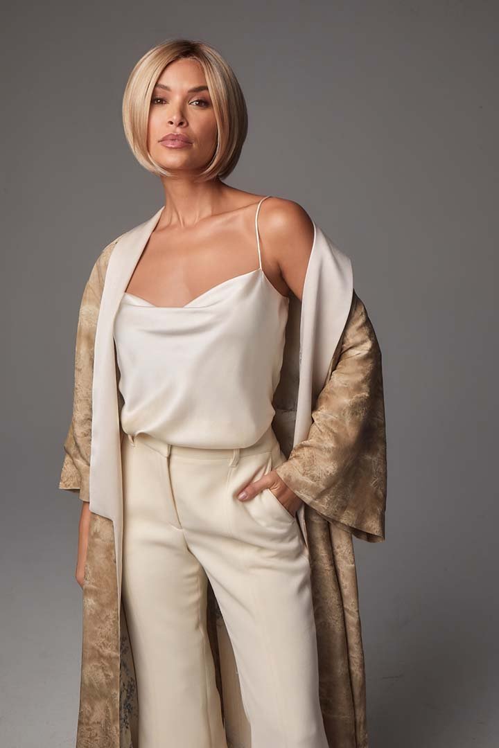 Ayumi by Noriko is a sleek, straight bob that combines modern sophistication with everyday versatility. This short-length blended fiber wig features a center part and a softly graduated shape that frames the neckline beautifully. Long, invisible face-framing layers and medium density create a polished, wearable silhouette suitable for any occasion.