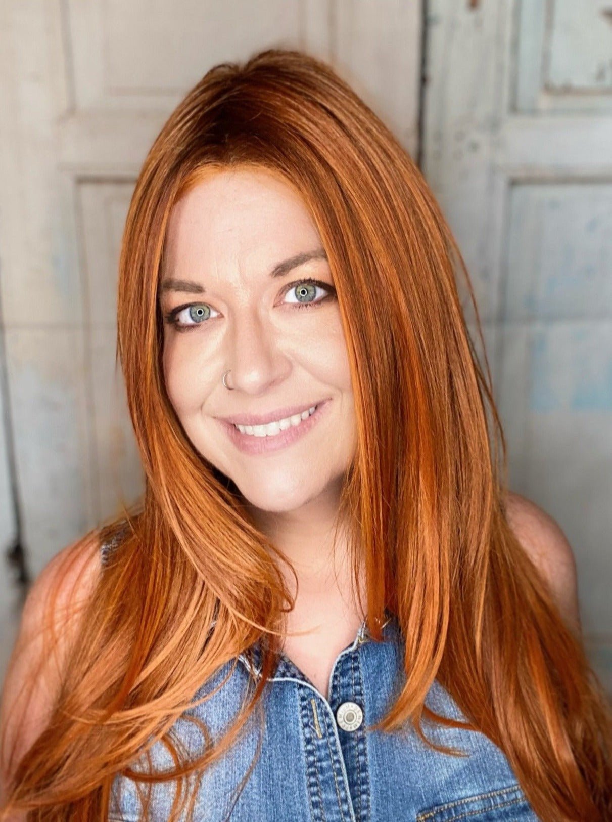 This color features a hybrid of pure red, strawberry blonde, a hint of paprika, and honey, with some copper undertones and medium brown roots with honey blonde hues.