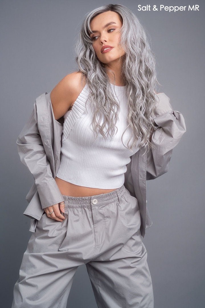• Smoke Ivory | Mid cool beige brown root, softly blended into white, platinum, and smoked ivory strands, which transcend into white tipped ends
