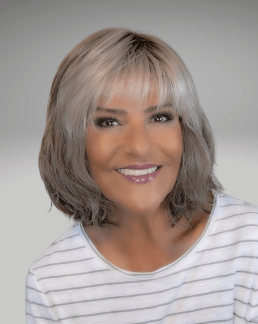 Mid-length layers of beachy waves, feathered bangs, a smooth silky top, and a bob back that falls below the collar. Featuring a Cool Comfort cap designed to mold itself and memorize the contours of your head for all-day, every-day comfort.