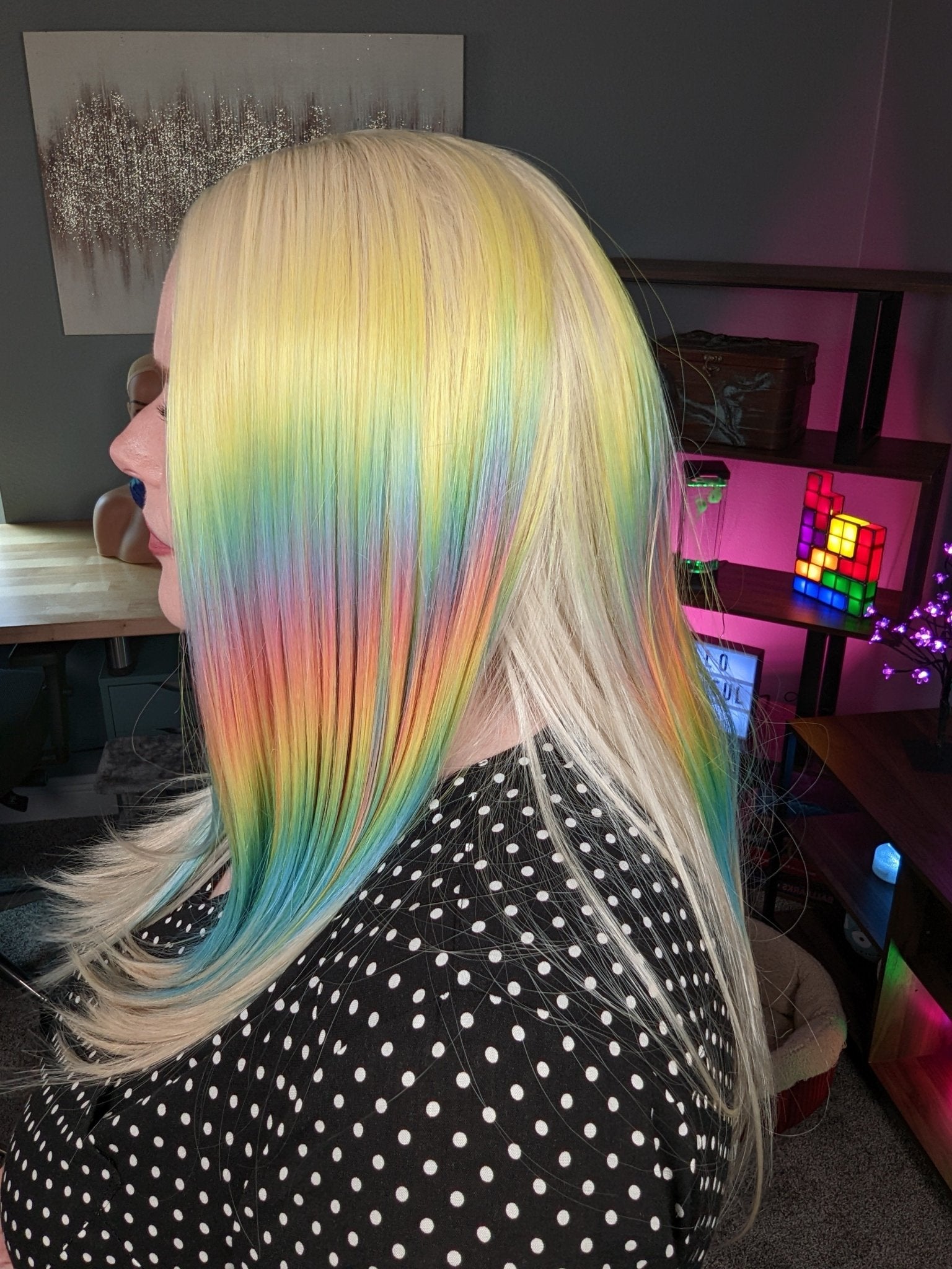This burst of pastel rainbow hues on platinum blonde hair is a fantasy look that’s as real as ever thanks to a smooth top, monofilament center part and lace front hairline. The Tru2Life heat-friendly synthetic fiber lets you change it up from straight to wavy in a flash.