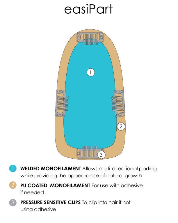 This topper clips in securely using pressure-sensitive clips, making it easy to apply, remove, and wear comfortably all day without damage. Available in 8", and 18" lengths, the easiPart collection is a go-to solution for women looking to restore volume, cover regrowth, or conceal thinning hair.