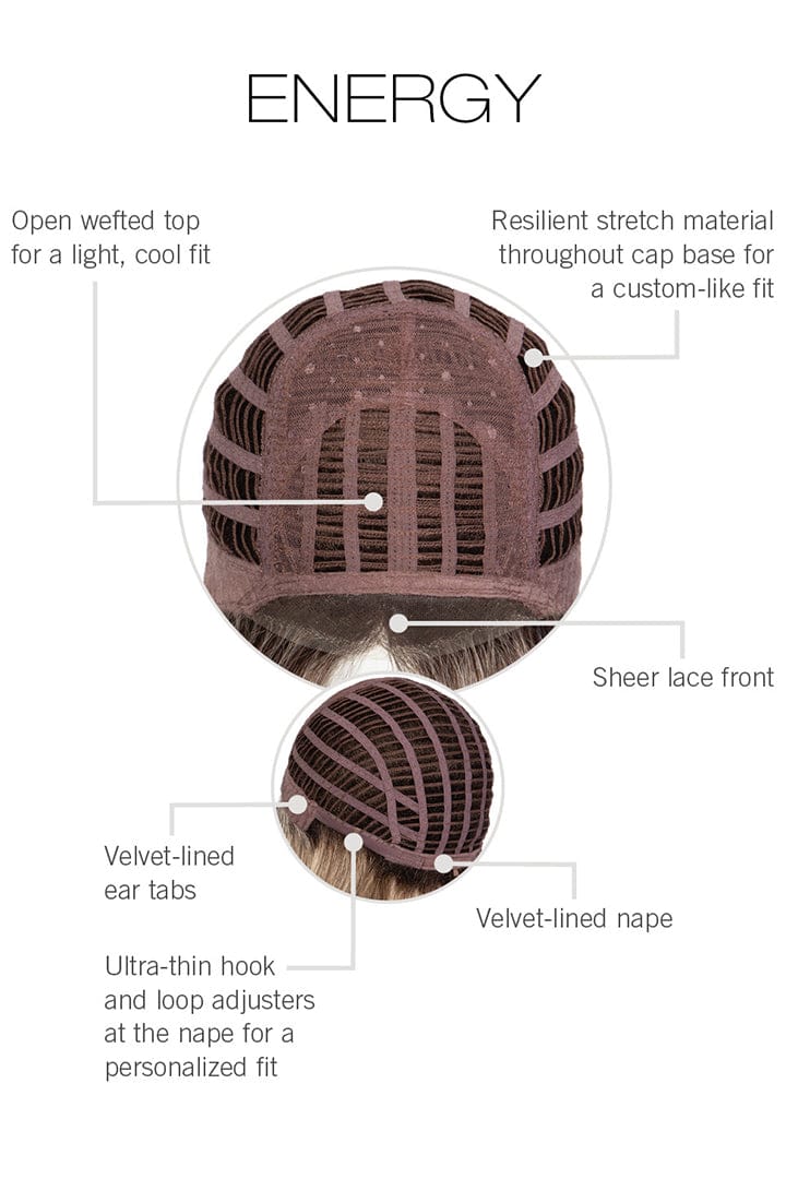 Designed for comfort, Energy features an open wefted top that promotes airflow for a light, cool feel. Resilient stretch material throughout the cap adapts to your head for a secure, custom-like fit. A sheer lace front creates a realistic hairline, while velvet-lined ear tabs and nape provide cushioned comfort. Ultra-thin hook-and-loop adjusters at the nape allow for easy, personalized sizing. Lightweight, breathable, and beautifully balanced, Energy delivers comfort and style you can rely on all day.
